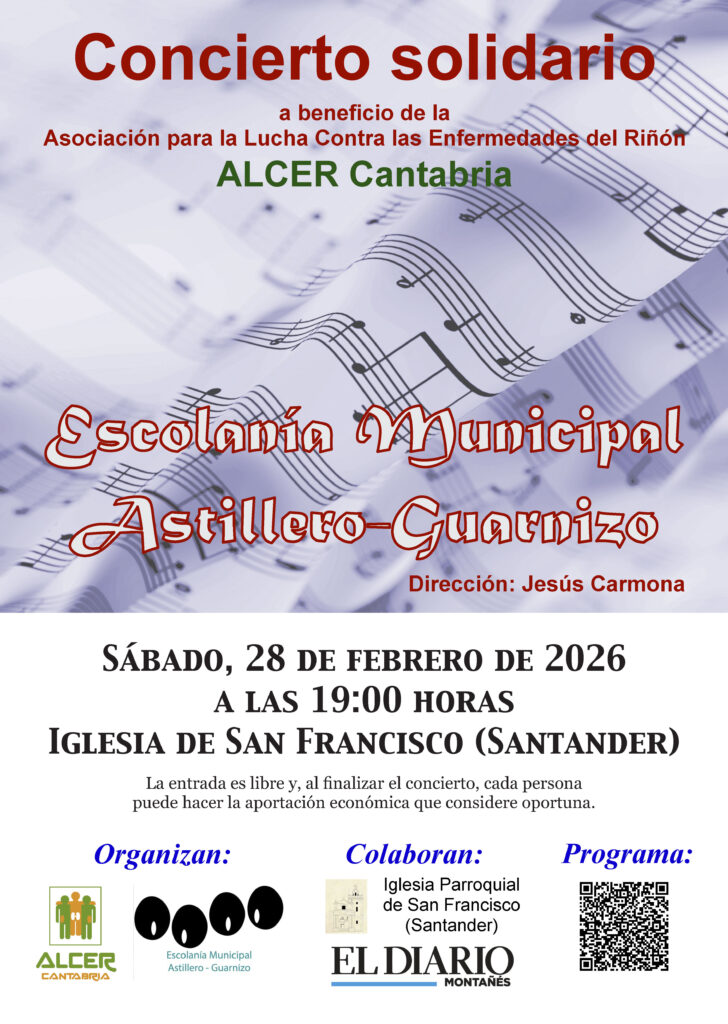 El próximo sábado 28 de febrero tendremos la oportunidad de disfrutar de un maravilloso concierto de la Escolanía Municipal Astillero Guarnizo. Además de disfrutar con su música, tendremos la oportunidad de colaborar económicamente con la labor de atención a las personas con enfermedad renal y sensibilización de la población general sobre la enfermedad renal y la donación de órganos que ALCER Cantabria realiza.